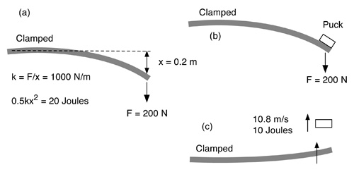 The elastic energy stored in the stick is given past 0.5kx 2. For example, if thou = k N/g and 10 = 0.2 m, and so the stored energy is xx Joules. In theory, that energy could be used to launch a puck at a speed of 15.3 m/s since the kinetic energy of the puck would so be 20 Joules. However, part of the stored elastic energy is used to accelerate the stick itself. If the aptitude section of the stick weighs 0.17 kg, and the puck weighs 0.17 kg, and then roughly half the elastic free energy will be given to the puck and the other half is used to advance the stick.